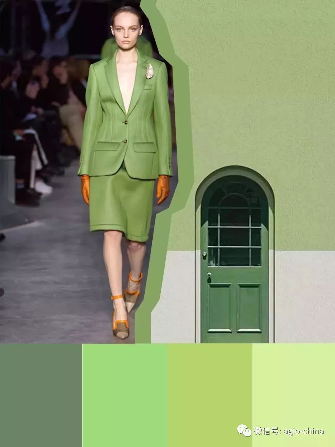牛油果绿横跨了绿色的多个层次,从浅到深,豆绿、草木绿、军绿......牛油果绿的饱和度适中,看上去有种“果泥”和“奶油”的质感。是绿色系家族里的文艺担当;迷人又高雅,富有生命力而又不轻挑。它既有活力绿色的清新,又带有灰度的柔和,饱和度类似莫兰迪色系,气质而柔和,充满亲切感。